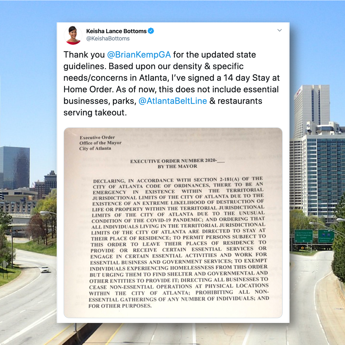 “Based upon our density & specific needs/concerns in Atlanta, I’ve signed a 14 day Stay at Home Order. As of now, this does not include essential businesses, parks, Atlanta BeltLine and restaurants serving takeout.”