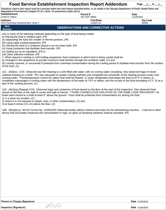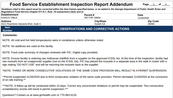 The management of Kang’s Table needs to correct the violations documented in the health report. A follow-up inspection will be conducted within 10 days of the inspection. Failure to fix the violations by then may result in suspension of the permit.
