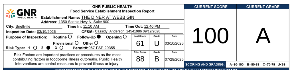 The Diner at Webb Gin was inspected by the GNR Public Health Department on March 10. The restaurant received a score of 61U after inspectors noted multiple health code violations.