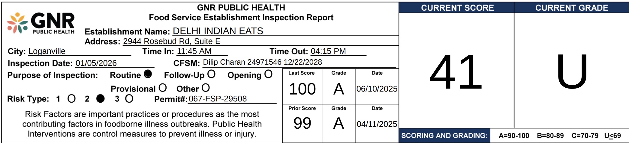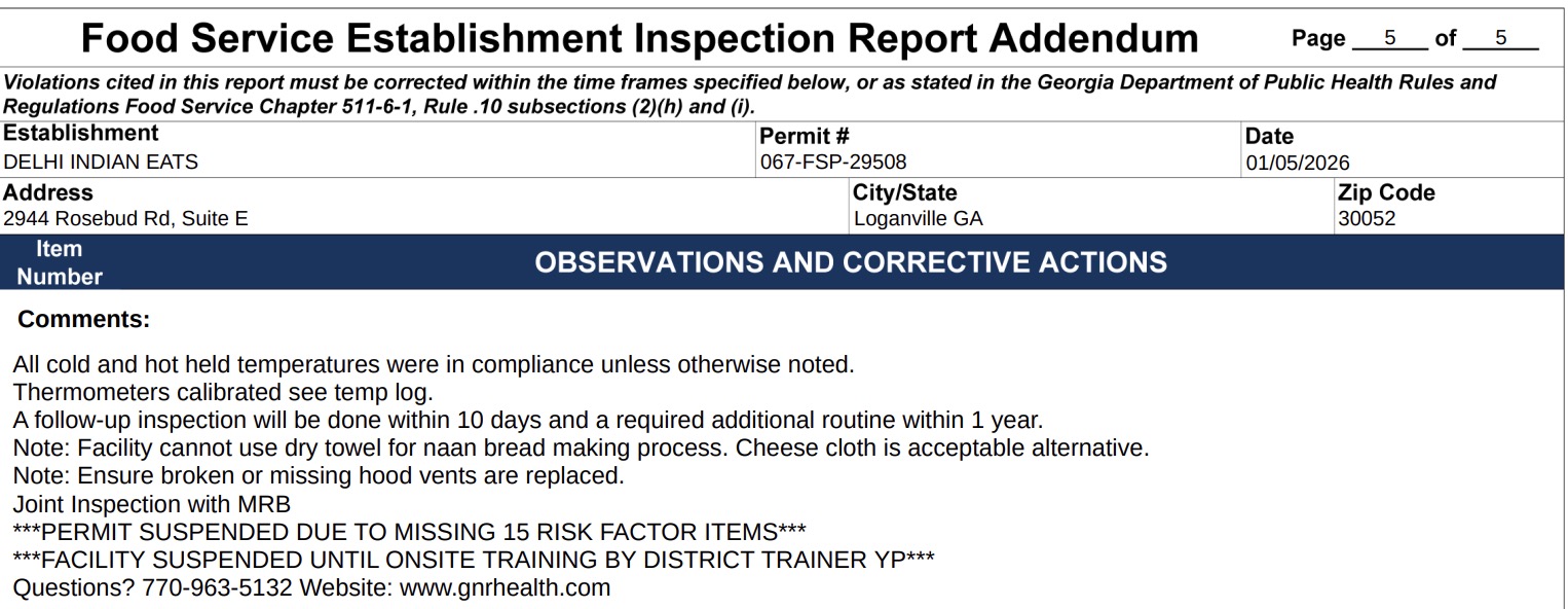 The Gwinnett, Newton & Rockdale County Health Department conducted routine health inspections on January 5. The inspection cited multiple violations at Delhi Indian Eats, leading to a failing score and suspension of the restaurant’s permit.