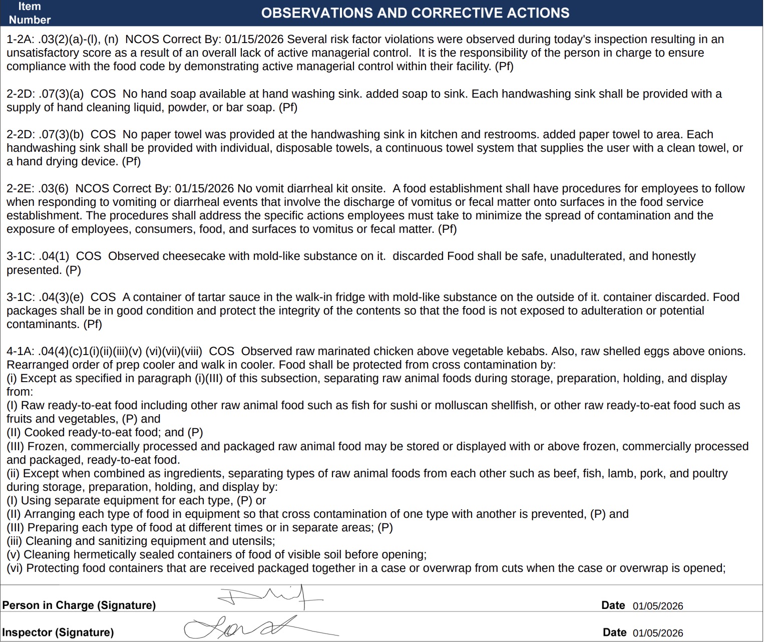 - The report said several risk factor violations were observed due to an overall lack of active managerial control. According to the reporthere were no paper towels available at the handwashing sinks in the kitchen and restrooms, and no hand soap was present at the handwashing sinks. Paper towels and soap were supplied during the inspection as corrective measures, the report noted.