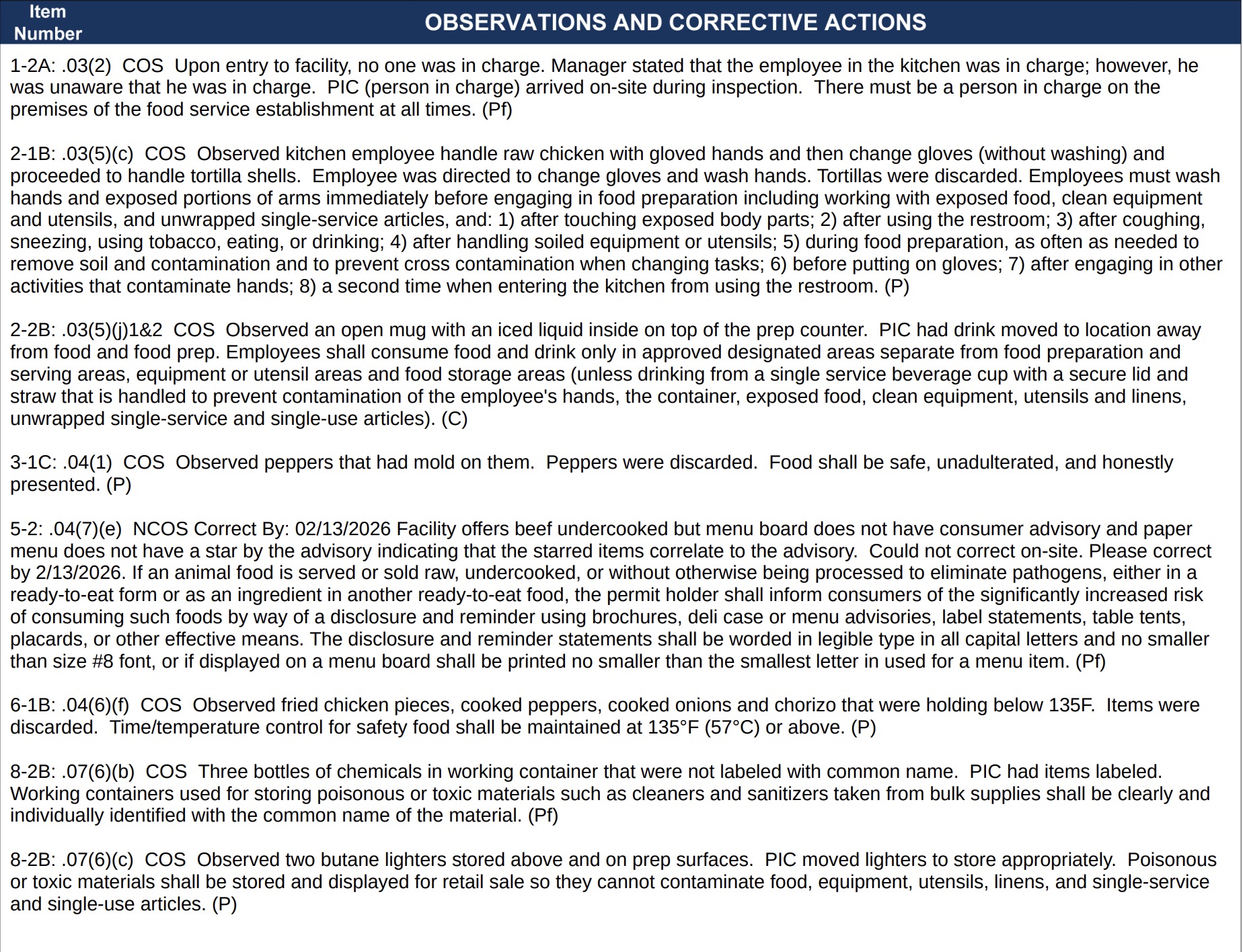 • The facility offers undercooked beef but failed to include a proper consumer advisory on the menu and menu board. This could not be corrected on-site and must be addressed by February 13, 2026, the report said.