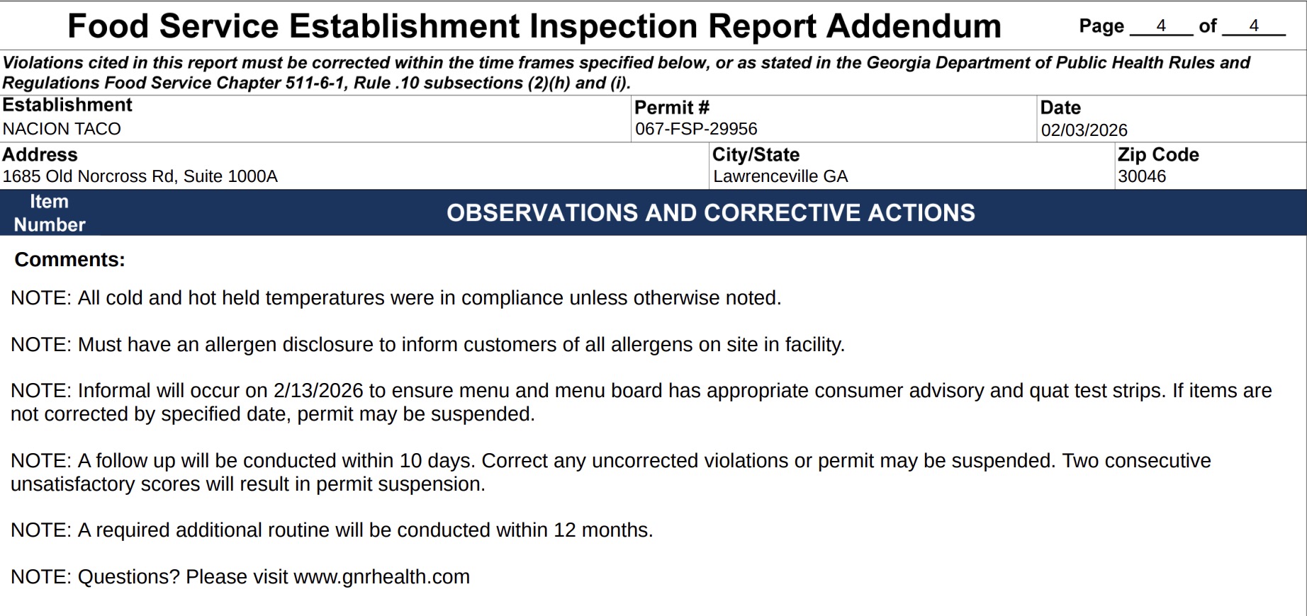 The Gwinnett, Newton, and Rockdale County Public Health departments carried out a routine check at Nacion Taco on February 3. The restaurant received a low score after the report identified several health code violations.