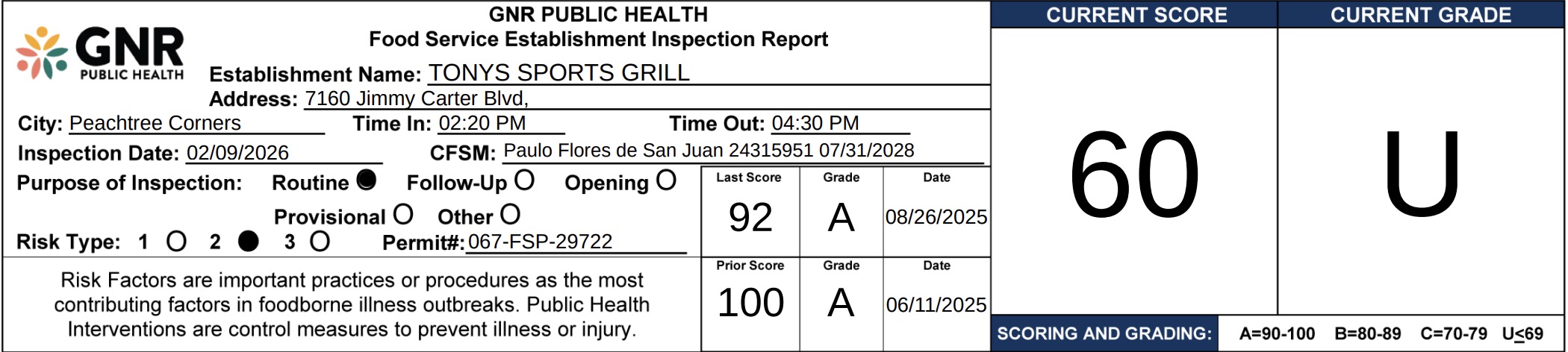 During an inspection on February 9, the Gwinnett, Newton, and Rockdale County Health Departments flagged Tony’s Sports Grill for several health code violations. The restaurant ended up receiving a low score of 60 U as a result.