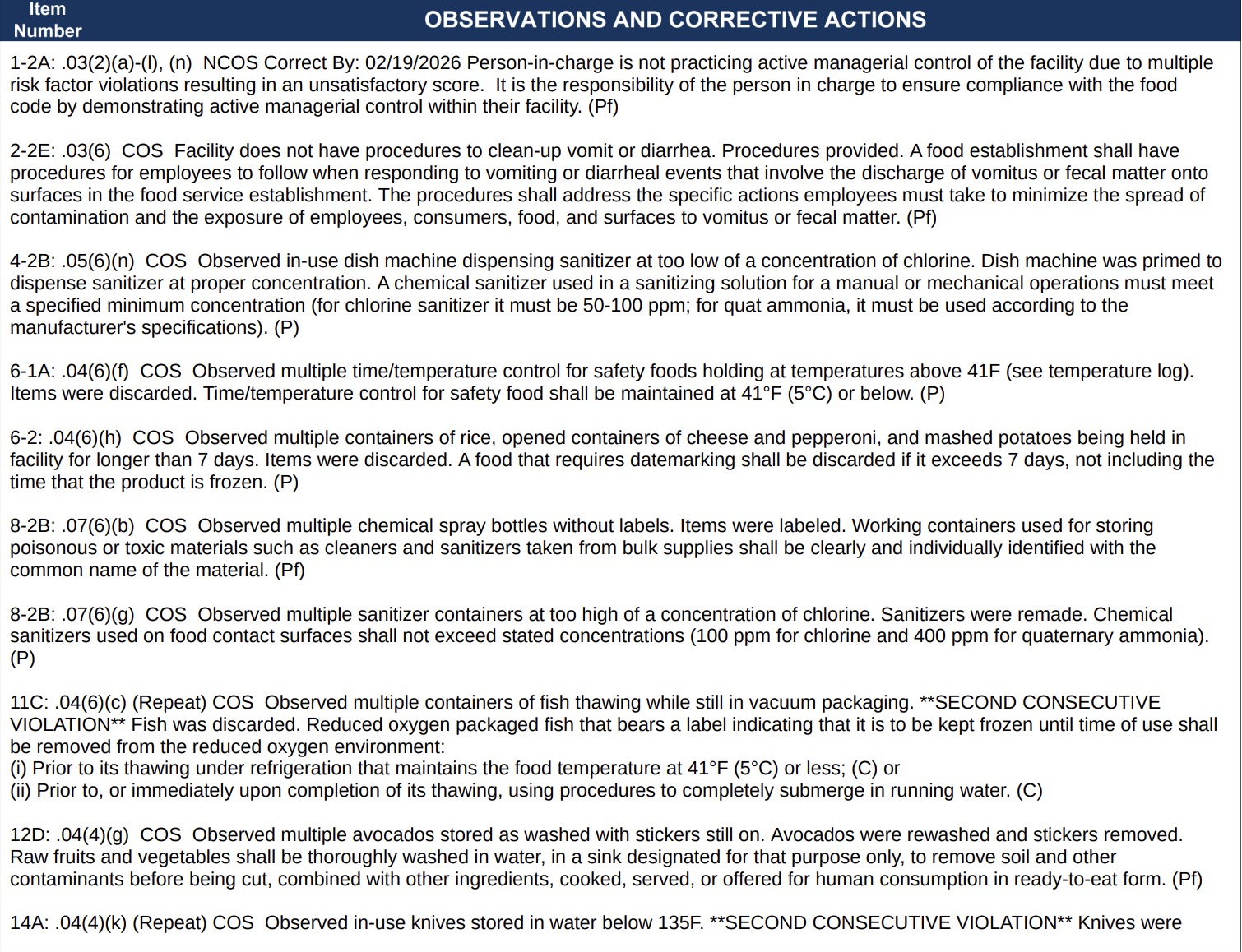 • The main prep cooler was not maintaining food at 41°F or below. The affected time/temperature control foods were discarded, and the cooler is expected to be repaired or replaced before February 19, 2026.