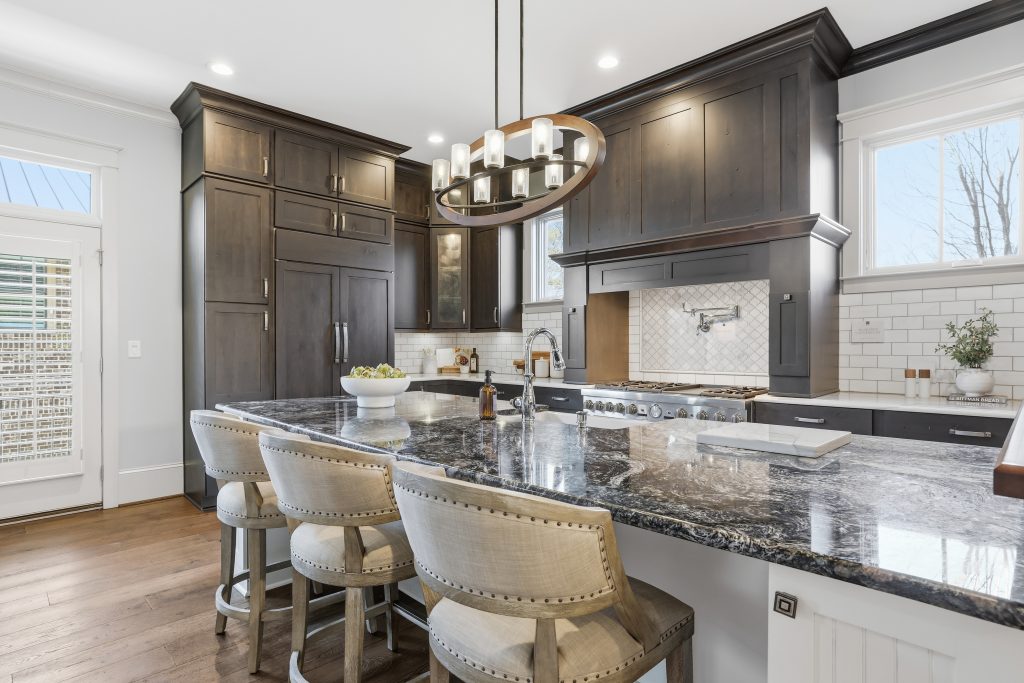 The family room centers around a stone fireplace with custom built-ins and window seats, opening through French doors to a classic front porch with tree-lined views. The dining area connects naturally to the kitchen, which features custom cabinetry, an exotic granite island, a 60-inch Thermador range with double ovens and griddle, a paneled Sub-Zero refrigerator, wine bar, walk-in pantry, and an adjoining keeping room. A small office on this level provides a practical spot for daily organization and household planning.