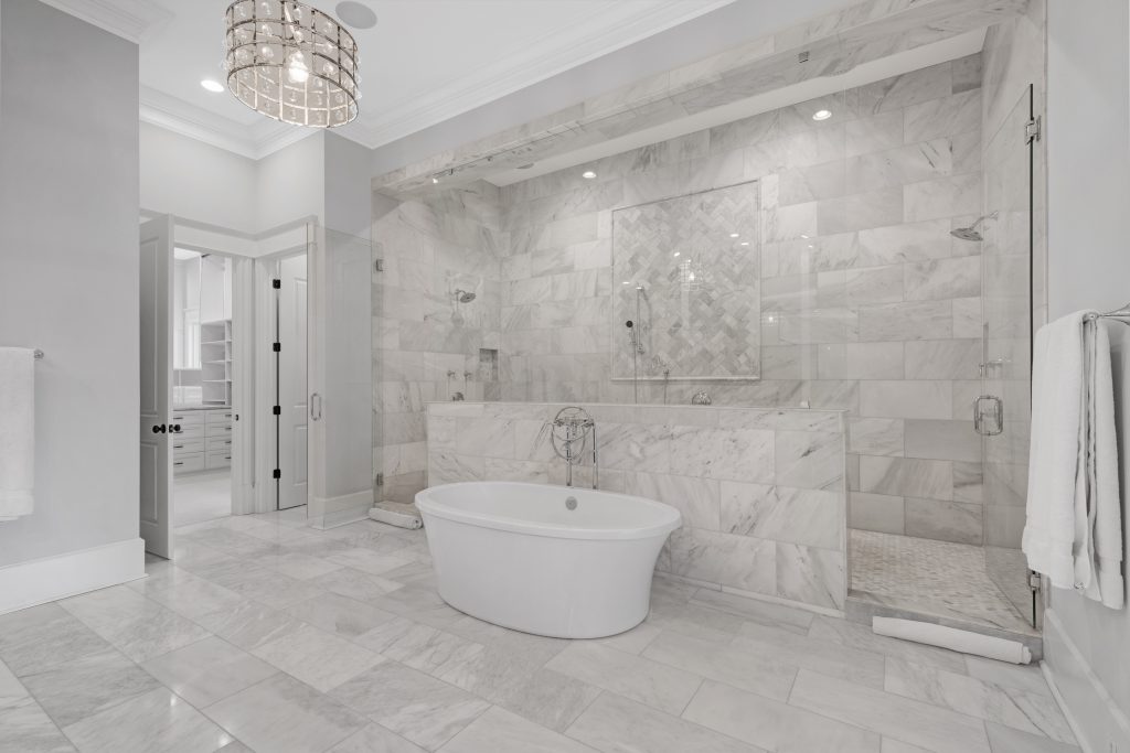 The owner’s suite is positioned on the main level and feels intentionally set apart. Tray ceilings, floor-to-ceiling windows, and private access to the deck create a calm retreat. The bathroom includes a large stone-tiled shower with herringbone flooring, a soaking tub, dual vanities with dedicated space, and a separate water closet. The custom closet is finished with built-in shelving and a center island, designed for storage and ease.