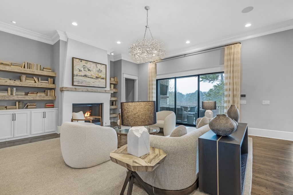 Substantial wood and wrought-iron doors open to a foyer with ceilings that stretch beyond 12 feet, immediately setting a sense of proportion that carries throughout the main level. Dark hardwood floors ground the open layout, while an oversized study lined with picture rail molding adds a quieter, more tailored space just off the entry. Views carry easily through the main living areas, anchored by a living room with a floor-to-ceiling fireplace, floating shelving, and expansive glass doors that draw outside into the home.