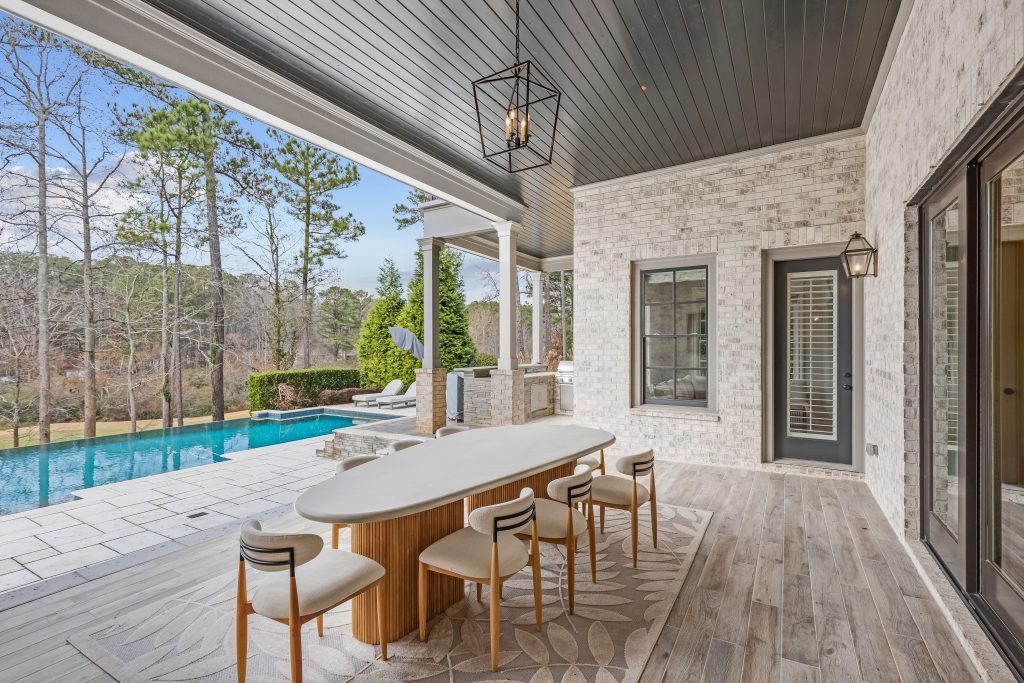 Outdoor living is approached with the same intention as the interior. Just beyond the living room, a covered deck with a fireplace looks directly onto the fairway, creating an easy place to unwind or entertain. Below, the terrace level opens to a private backyard framed by professional landscaping and lighting. An infinity-edge saltwater pool and spa sit within limestone-style decking, joined by a covered patio with shiplap ceilings, and a fully equipped outdoor kitchen with bar seating and grill.