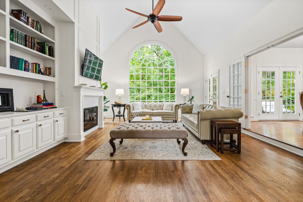 The two-story foyer opens into a soaring great room with cathedral ceilings, custom-built-ins, and a cozy fireplace with a dramatic two-story window. Natural light fills the space, creating a bright and welcoming atmosphere. A formal dining room accommodates large gatherings, while a refined living room adds balance to the main level.