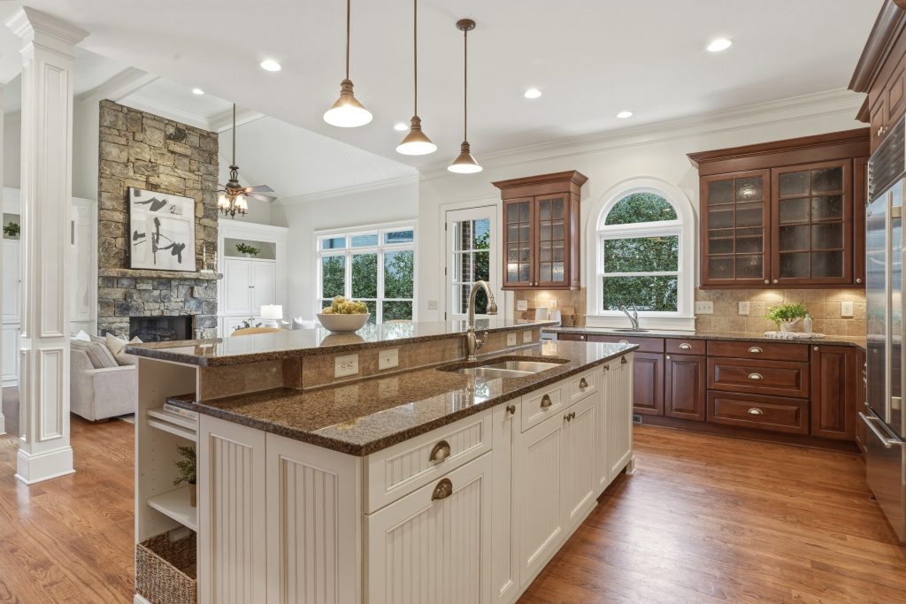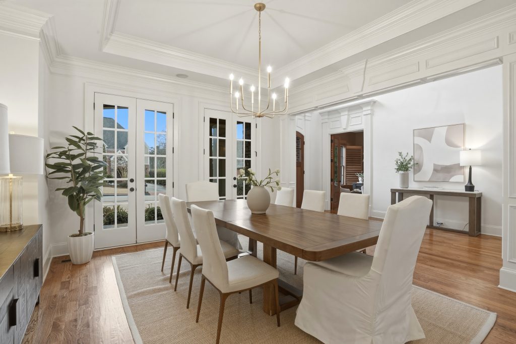 The brick and stone exterior opens to a floor plan defined by site-finished hardwood floors, elevated ceilings, and detailed millwork. A two-story family room with coffered ceiling and gas fireplace anchors the main level and connects directly to the kitchen. The kitchen is equipped with a six-burner Dacor gas cooktop, double Dacor ovens, SubZero refrigerator, built-in wine cooler, ice maker, and custom pantry cabinetry. Nearby keeping areas and the formal dining room, featuring double French doors to the front porch allow for natural flow between gathering spaces.