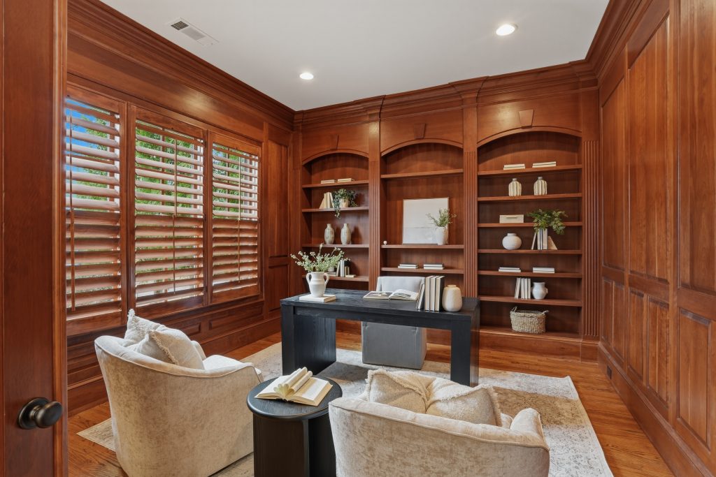 A cherry-paneled study with plantation shutters provides a dedicated office on the main level. The owner’s suite also occupies the main floor and includes private access to the covered porch, dual custom walk-in closets, separate vanities, and a jetted tub. The laundry room is positioned on the main level as well and includes built-in cabinetry, a utility sink, and washer and dryer that remain with the home.