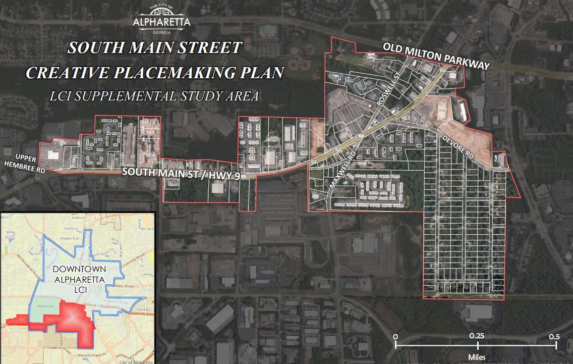 In early 2021, the Alpharetta Mayor and City Council authorized Staff to submit an application to the Atlanta Regional Commission’s (ARC) Livable Centers Initiative (LCI) Program seeking grant funding for the South Main Street LCI Supplemental Study. ARC awarded the City $160,000.00 to complete the Study, with the City committed to a 20% match of $40,000.00.