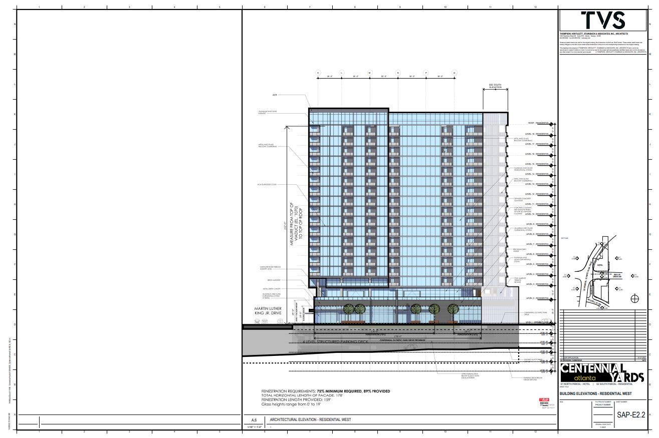E.2. is a 1.1-acre site that extends below half of M.L.K. Jr. Drive sits alongside the Norfolk Southern right-of-way to the east, adjoins Mitchell Street viaduct to the south, and spans over Elliot Street to the west to connect to the Centennial Olympic Park Drive viaduct. E.2 is zoned MRC-3-C. Currently proposed is a residential tower with 303 units over street-level retail. A shared parking podium extends over both parcels and below M.L.K. Jr. Drive. The variations requested below align with the previously approved master SAP for Centennial Yards development and apply to both E.1 and E.2 parcels.