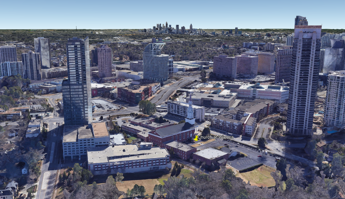 Developers submitted plans for the project in May which propose a 400-unit apartment tower and a 512,000 SF office building connected by a shared parking deck on the southern corner of the property, at the intersection of Peachtree and Wieuca. This would presumably mean the existing fellowship hall currently occupying that space would be demolished.