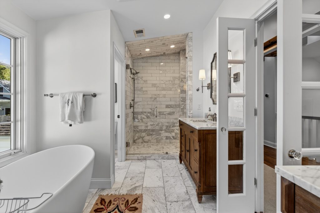 Three bedrooms and two full baths are also conveniently located on the main floor, while the upstairs holds a guest suite, laundry room, and a primary suite that feels private but not remote. Dual walk-in closets, a soaking tub, and separate shower bring understated luxury to the space.