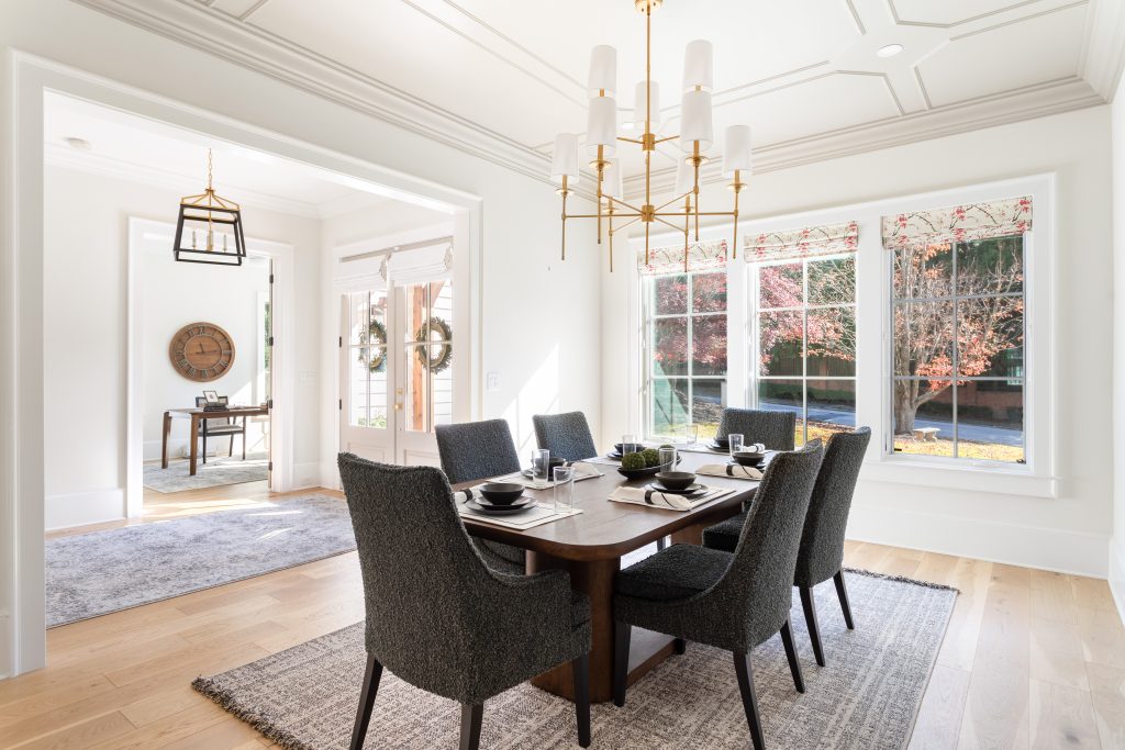 The main level is designed for gatherings and unwinding. The kitchen anchors the space with Viking appliances, an eight-burner range, custom hood, and a generous island surrounded by windows. Touches including leather-wrapped pendants, textured finishes, practical storage adds function and style. Just steps away, the dining room comes ready for entertaining offering a cocktail bar, wine storage, and pantry that elevates hosting.