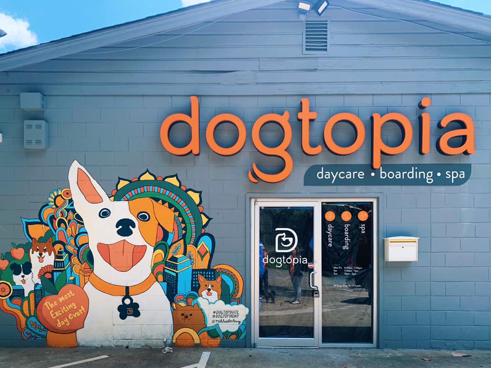 In celebration of the new location, Dogtopia has teamed up with local artist and SCAD student, Cherry Chandra, to commission a unique wall mural showcasing Dogtopia’s mascot, Scruffy, set behind Atlanta’s skyline.
