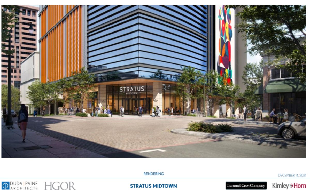 Working in conjunction with Duda Paine, Kimley Horn, and HGOR, Trammell Crow presented updates to their proposed mixed-use office project located at 80 Peachtree Place NE known as “Stratus Midtown” to the Midtown Development Review Committee on December 14, 2021. As reported last month by What Now Atlanta, the plans were initially presented to the DRC during their November meeting, resulting in several requested amendments and changes to the project.