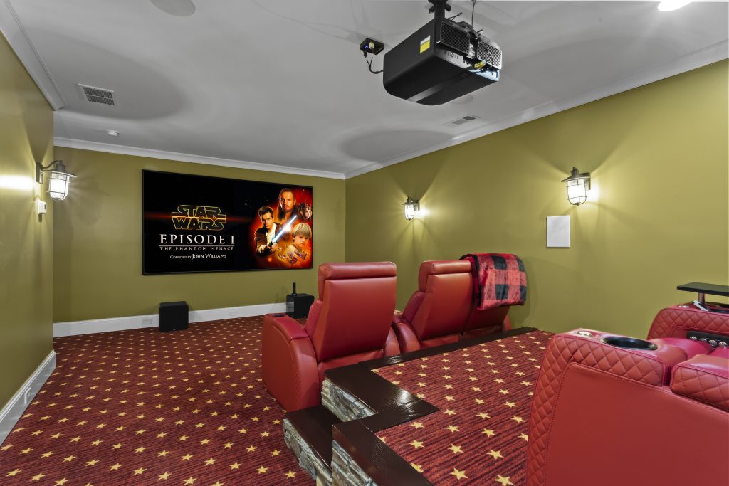 On the terrace level, a large open area suited for work or recreation is joined by a fifth bedroom, full bath, and a dedicated theater room with a 110-inch screen. Sliding doors lead to a covered patio with a fireplace, gas lanterns, ceiling fans, and retractable screens.