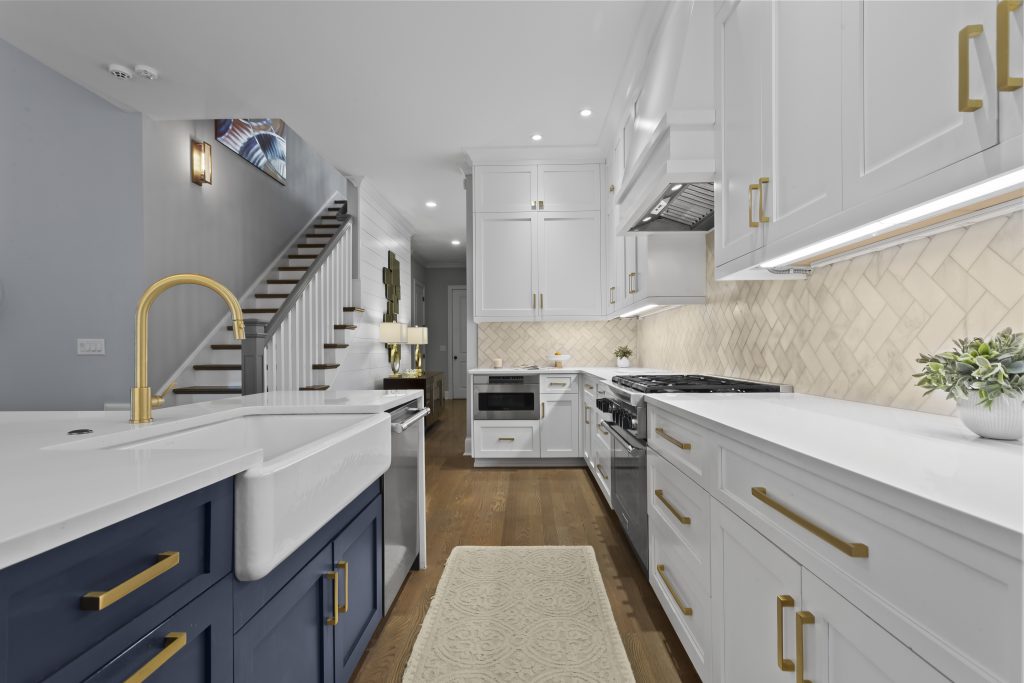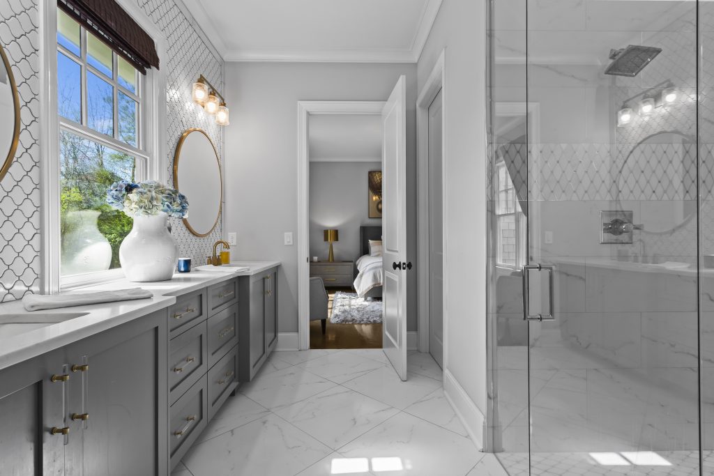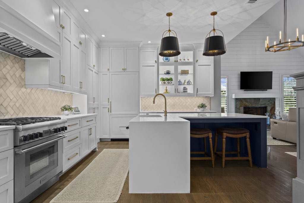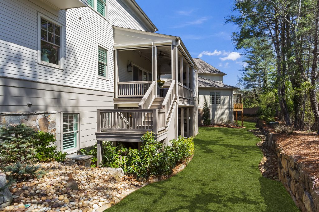 This custom-built home in East Cobb sets on a landscaped cul-de-sac lot within The Oaks at Mill Pond. The exterior combines cedar shake and stone, with a full daylight terrace level extending the home’s footprint.