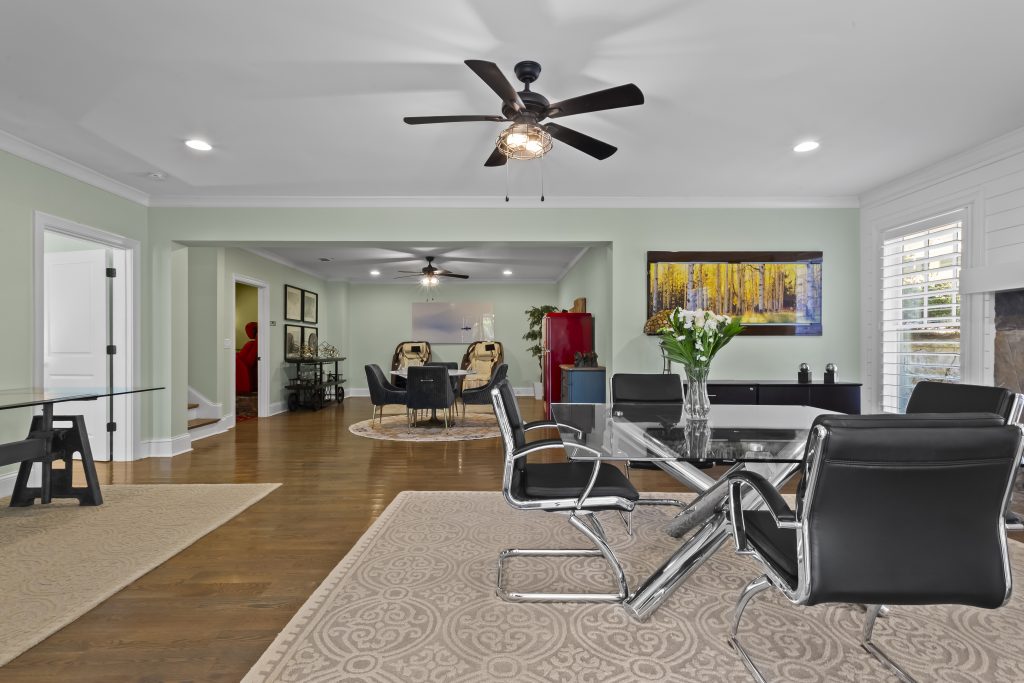 A covered portico leads into the foyer, where site-finished hardwood floors and detailed millwork continue throughout the main level. A private office sits just off the entry, filled with natural light and finished with plantation shutters found across the home.