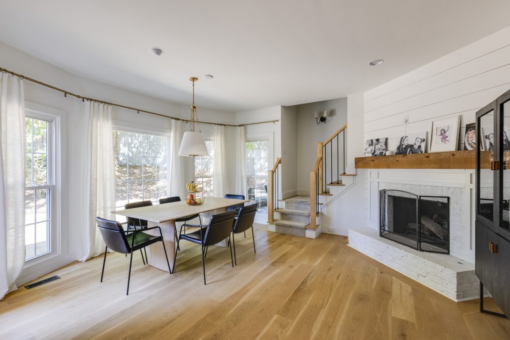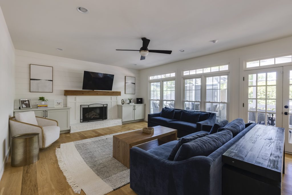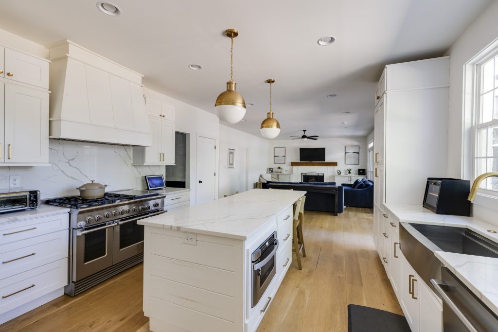 The main living area opens with a welcoming fireplace, bright windows, and easy flow between spaces, perfect for gatherings or a quiet night in. At the center of it all, the kitchen shines with its shaker cabinetry, stone countertops, and a custom range hood framing a high-end range. A large island anchors the space, ideal for prep, casual meals, or conversation.