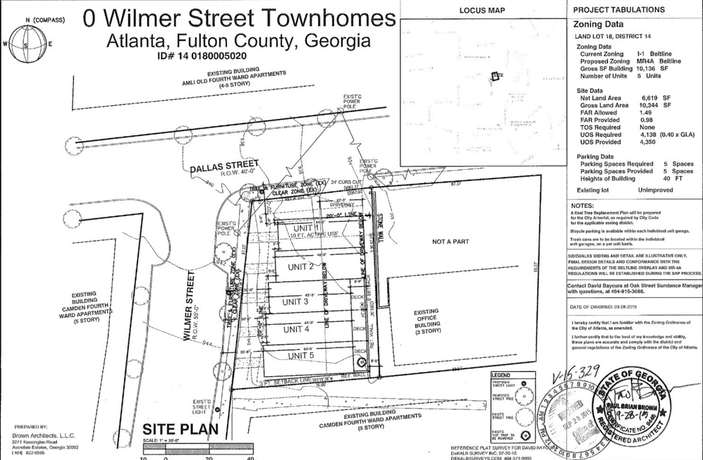 At the end of last year, site plans drafted by Brown Architects of Avondale Estates were filed with City of Atlanta, pictured below. Three units will feature decks.