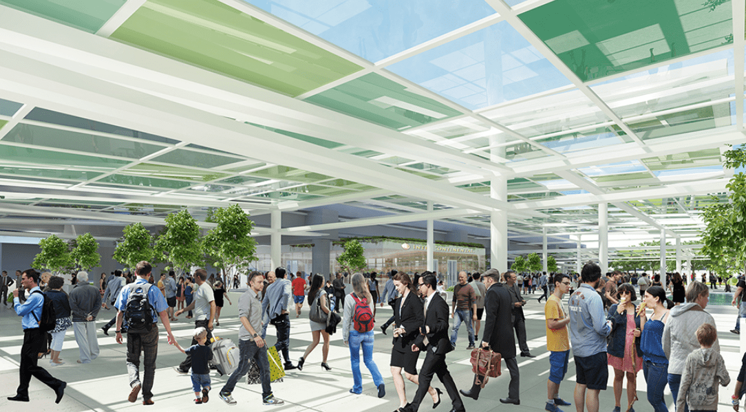 A connection to the west side of the terminal would be created via a pedestrian plaza beneath a canopy, creating an arcade featuring landscaping, hardscape and water features. A cafe is also forthcoming and would offer indoor and outdoor seating.