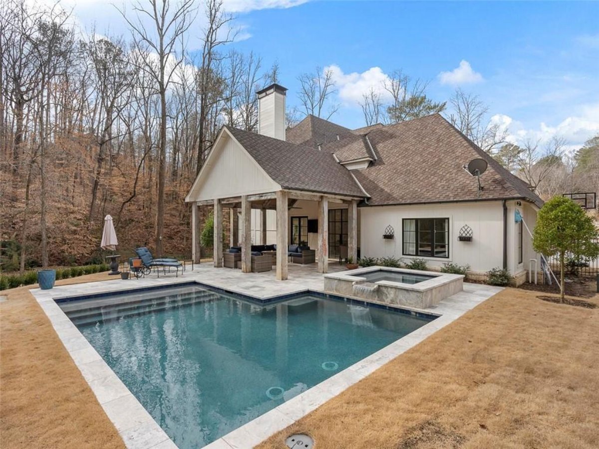 Beyond the interior, this home’s outdoor spaces are an entertainers’ dream. The backyard features a massive, covered stone patio with ample seating, a saltwater pool and hot tub, as well as a fire-pit and gazebo area.