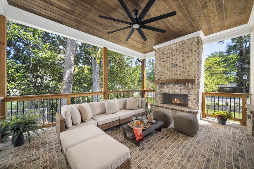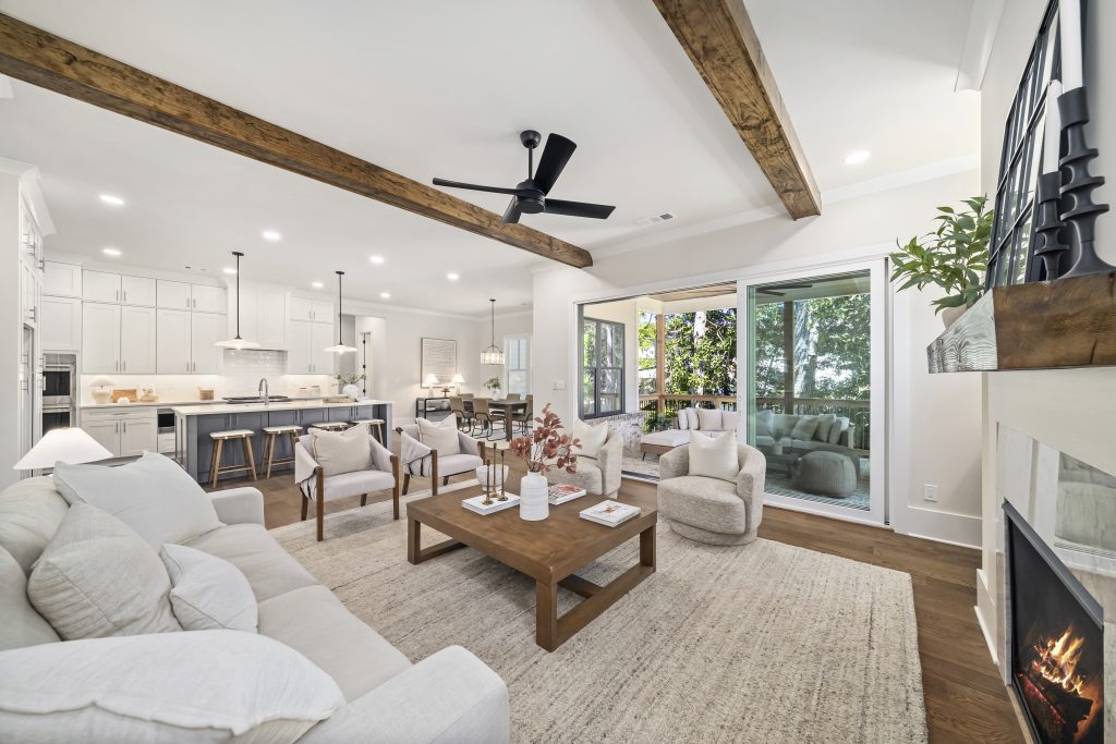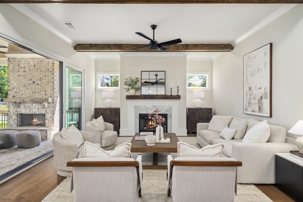 At the center of the home, the kitchen is equipped with Wolf and Cove appliances, an oversized quartz island, custom cabinetry, and a walk-in pantry, along with a separate butler’s pantry that includes wine refrigeration. The open living area is anchored by a fireplace and exposed beams, with wide-plank flooring continuing throughout. A pocketing sliding door leads to a covered terrace with its own fireplace, extending the main level outward.