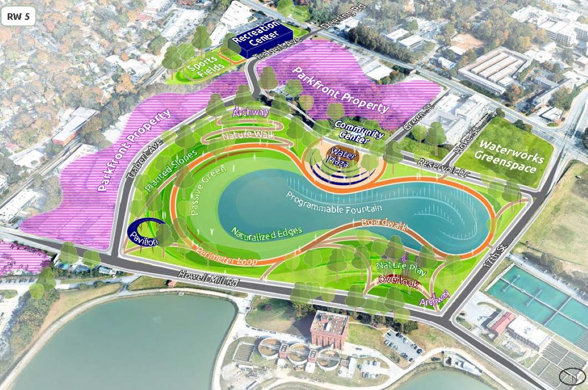Among the most substantial proposals is to “Reclaim the Waterworks for the Public” which would reopen the Hemphill Reservoir to the public to expand the existing Waterworks Park by 147-acres, a project that would nearly meet the plan’s goals of increased greenspace in one fell swoop. The plan includes a concept for the park which includes trails, a boardwalk, playscapes, a community center, plaza and a wooded-area.