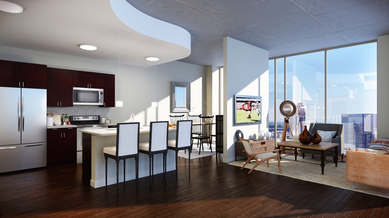 The top six floors are made up of 68 premium one and two bedroom apartment homes with larger floor plans, ten foot ceilings, quartz countertops and other amenities including double sink vanities and half baths. All units have private balconies.