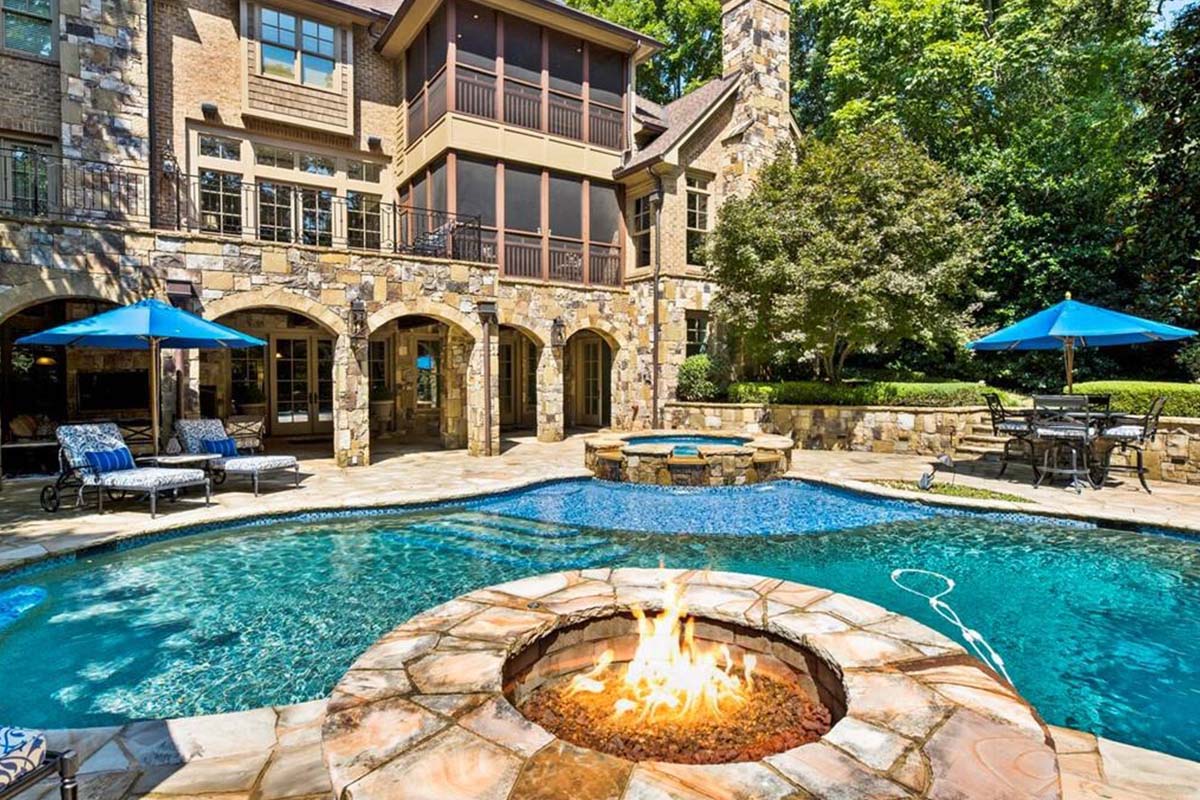 Located in a gated community across from Chastain Park, this sought-after floor plan doesn’t skimp on details! Featuring six bedrooms and six and a half bathrooms, the 9,125-square-foot home has three levels constructed with antique beams, walnut flooring, and custom millwork throughout.