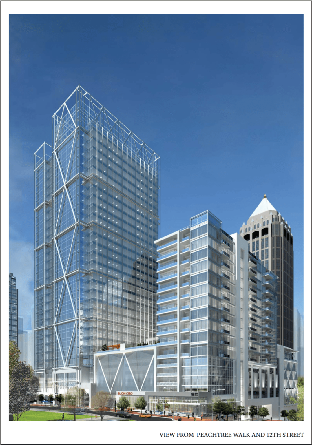 The 32-story office tower leads the project, and would be located on West Peachtree between 12th and 13th Streets, encompassing the entire city block east to Peachtree Walk.