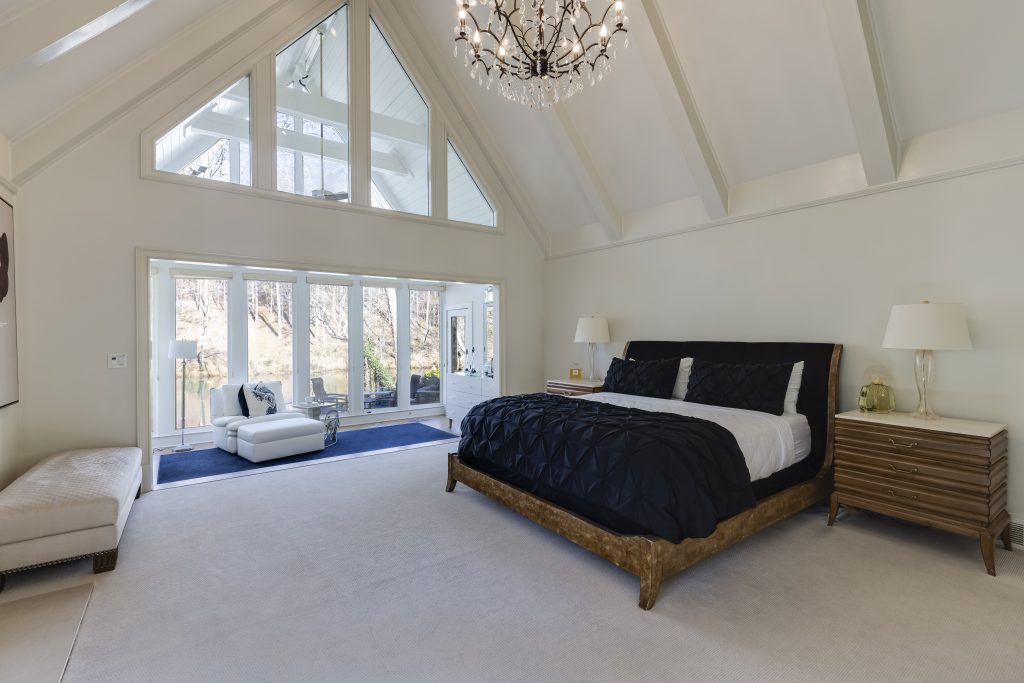 Crafted to keep meals and movement seamless, the kitchen is designed with custom cabinetry, double ovens, a Sub-Zero refrigerator, two dishwashers, and a large center island. A cozy desk nook and butler’s pantry add convenience, while the adjoining breakfast room and family room carry the same vaulted ceilings and walls of glass. Step out to the stone patio or deck where views of the water are interrupted.