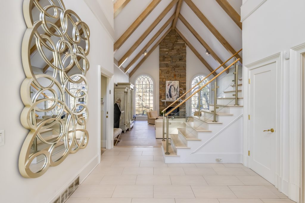 The entry foyer sets the tone with two-story ceilings and sunlight spilling across the hardwoods. Just beyond, the vaulted great room rises dramatically with timber beams overhead and a stacked-stone fireplace anchoring the space. A wall of arched windows looks straight to the river, keeping nature at the center of the home’s story.