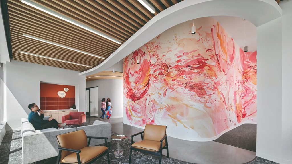 The colors also ensure that employees and guests always know they are at Piedmont, despite the separate levels occupied by the company. Cooper Carry’s Experiential Graphic team worked with the company to commission an original watercolor mural by local artist Christina Kwan. The mural incorporates vibrant reds and oranges, along with a magnolia flower that is emblematic of Piedmont’s branding.