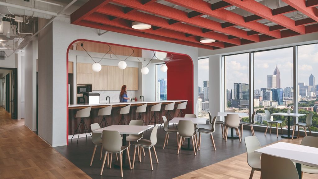 It includes shared meeting rooms, collaboration zones, and coffee bars. The new office has a non-reservable huddle room in every corner. These huddle rooms offer sweeping city views and create natural spaces for collaboration.