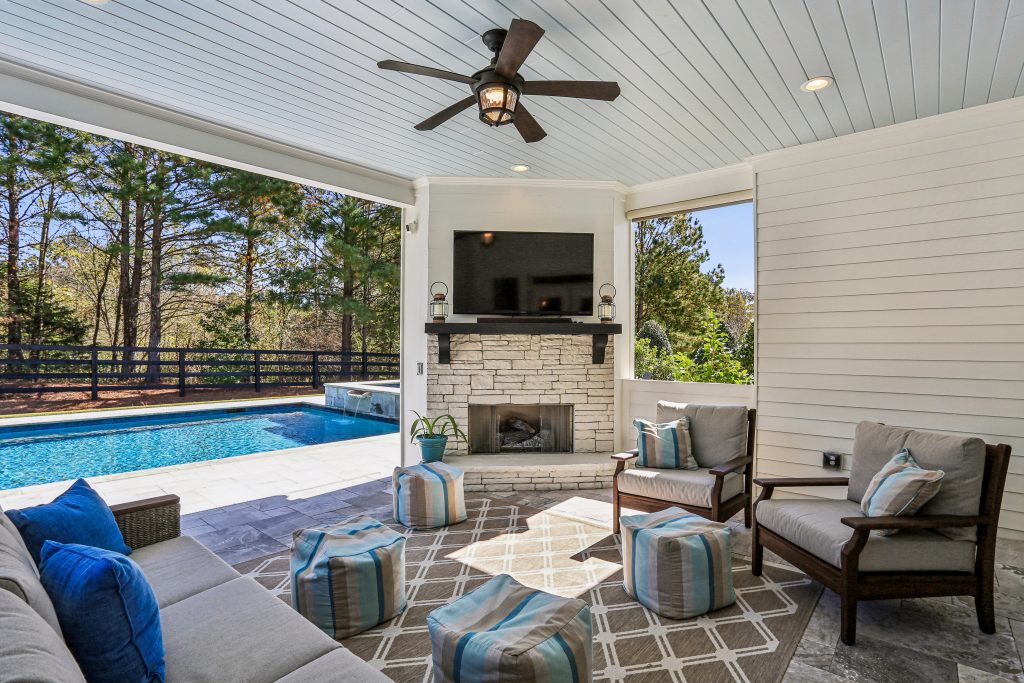 The covered patio with fireplace and TV extends the living space outdoors, ideal for year-round enjoyment. Beyond, the level lawn offers plenty of room for leisure or play, surrounded by professional landscaping that enhances both privacy and ambiance.
