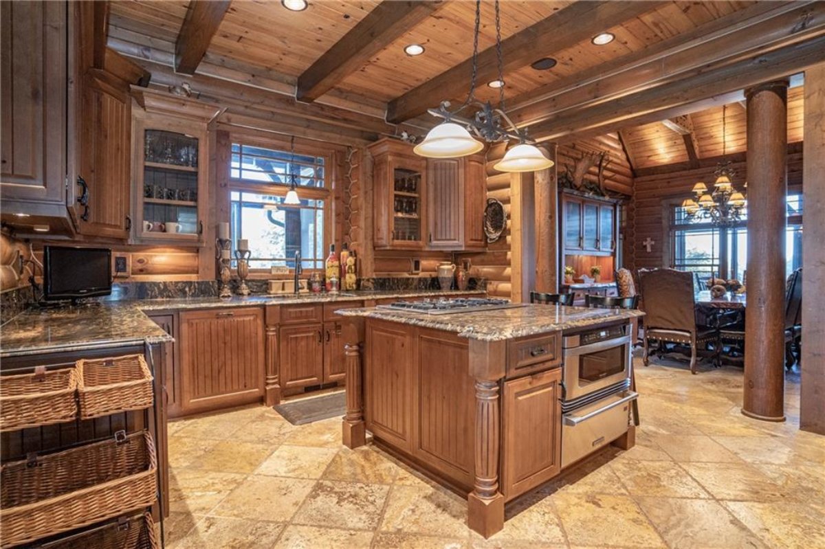 The property features a stately timber frame home with beautiful hardwood and stone floors throughout, a gourmet chef’s kitchen with upgraded, stainless-steel appliances, a grand dining room that seats 12+, a great room with 30’ foot vaulted ceilings and a floor-to-ceiling fieldstone-stacked fireplace, and captivating views from every room. The main level also features a sports room with a pool table, multiple bedrooms with en suite baths, an office, and warm, wood-paneled walls throughout.