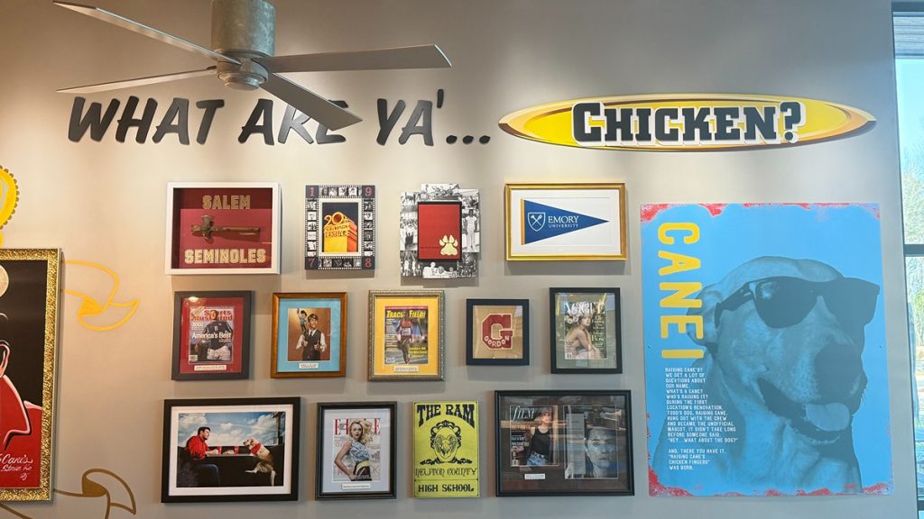 The restaurant also honors standout area athletes like Clint Mathis and Candace Hill. These are all pieced together as part of Raising Cane’s story and photos of its yellow Labrador mascot and namesake, Cane.