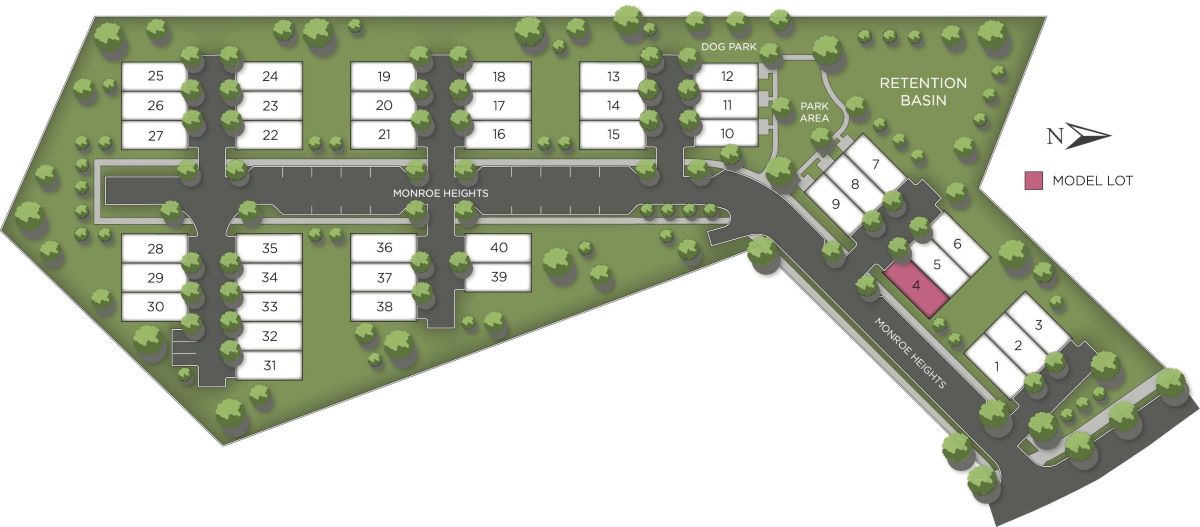 The townhomes will be built around along a new entry road, Monroe Heights, in buildings with two to five units each. The community will also include a small dog park and a retention basin.