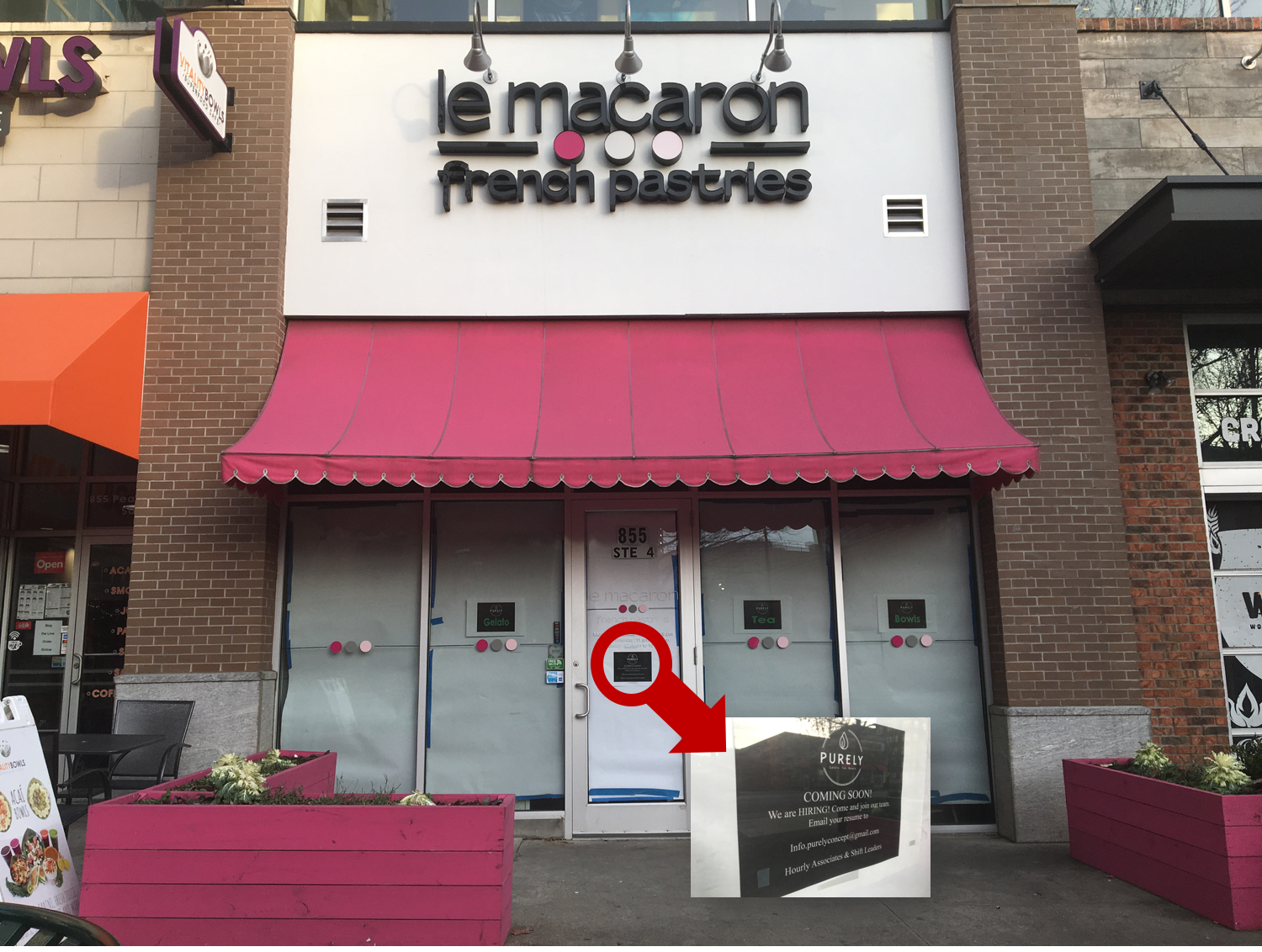 Purely would serve gelato, tea, and “bowls” in the now-shuttered Le Macaron space, according to signage at the Viewpoint Midtown locale.