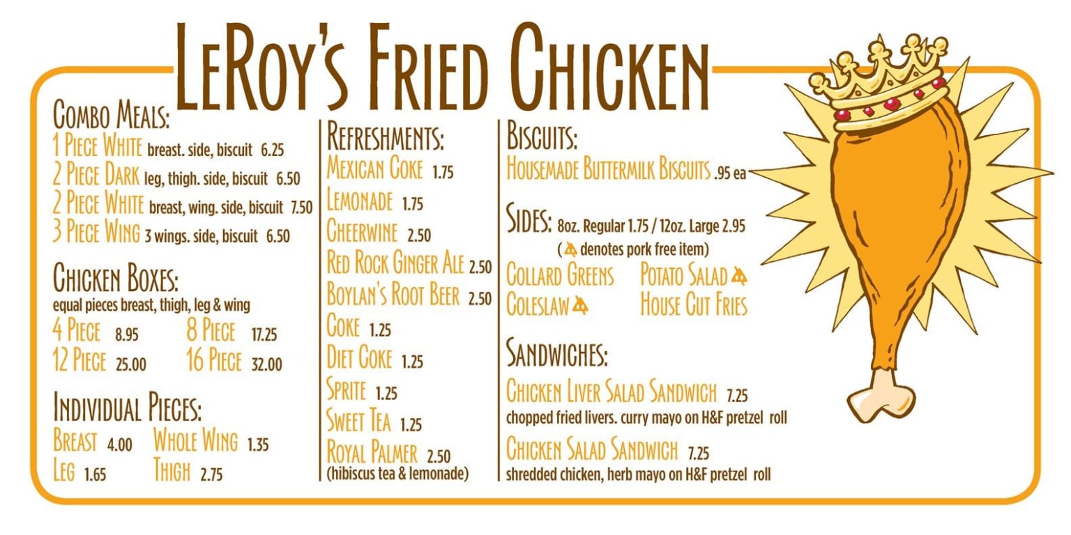 Obviously, I did not return, nor did I recommend the place. ‘Did you try Leroy’s?’ ‘I thought about it, but then I remembered that it is insane to pay $15 for two pieces of carry-out fried chicken, a side and a coke’