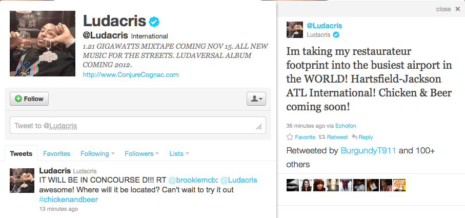 “Im taking my restaurateur footprint into the busiest airport in the WORLD! Hartsfield-Jackson ATL International!,” Ludacris tweeted. “Chicken & Beer coming soon!”