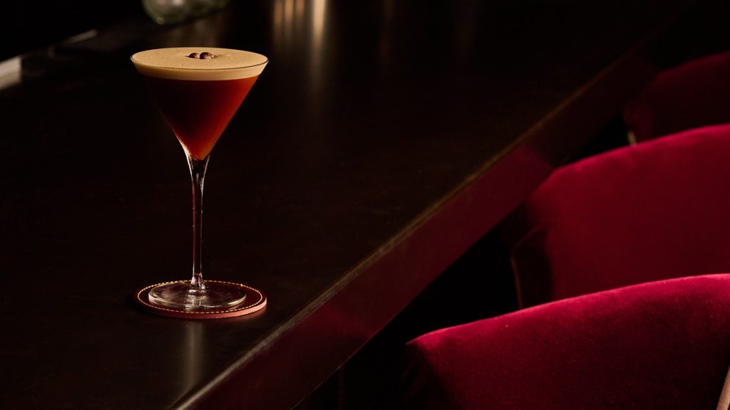 The interior features rich wood, terrazzo flooring, velvet accents, and dim lighting. It creates a warm and upscale atmosphere accented by artwork from notable Atlanta figures.