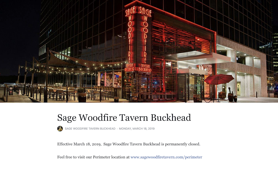 “Effective March 18, 2019, Sage Woodfire Tavern Buckhead is permanently closed,” the restaurant Monday posted to its Facebook page.