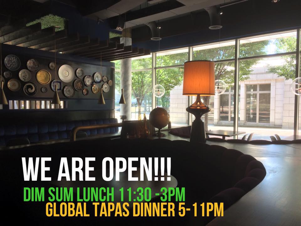 The graphic announces Dim Sum Lunch from 11:30 AM to 3 PM and a Global Tapas Dinner from 5:00 to 11:00 PM.