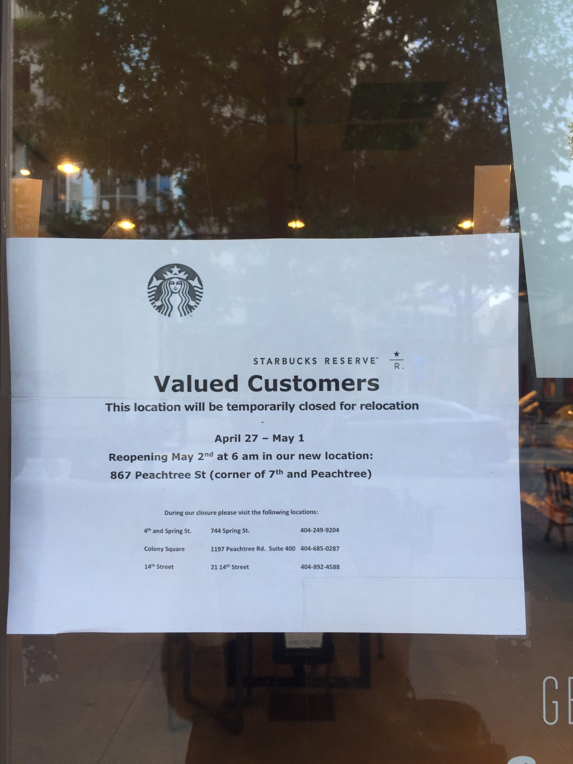 The store will be closed in preparation for the forthcoming Starbucks Reserve, which will open just a few steps away May 2 at 6:00 AM at the corner of 7th and Peachtree.